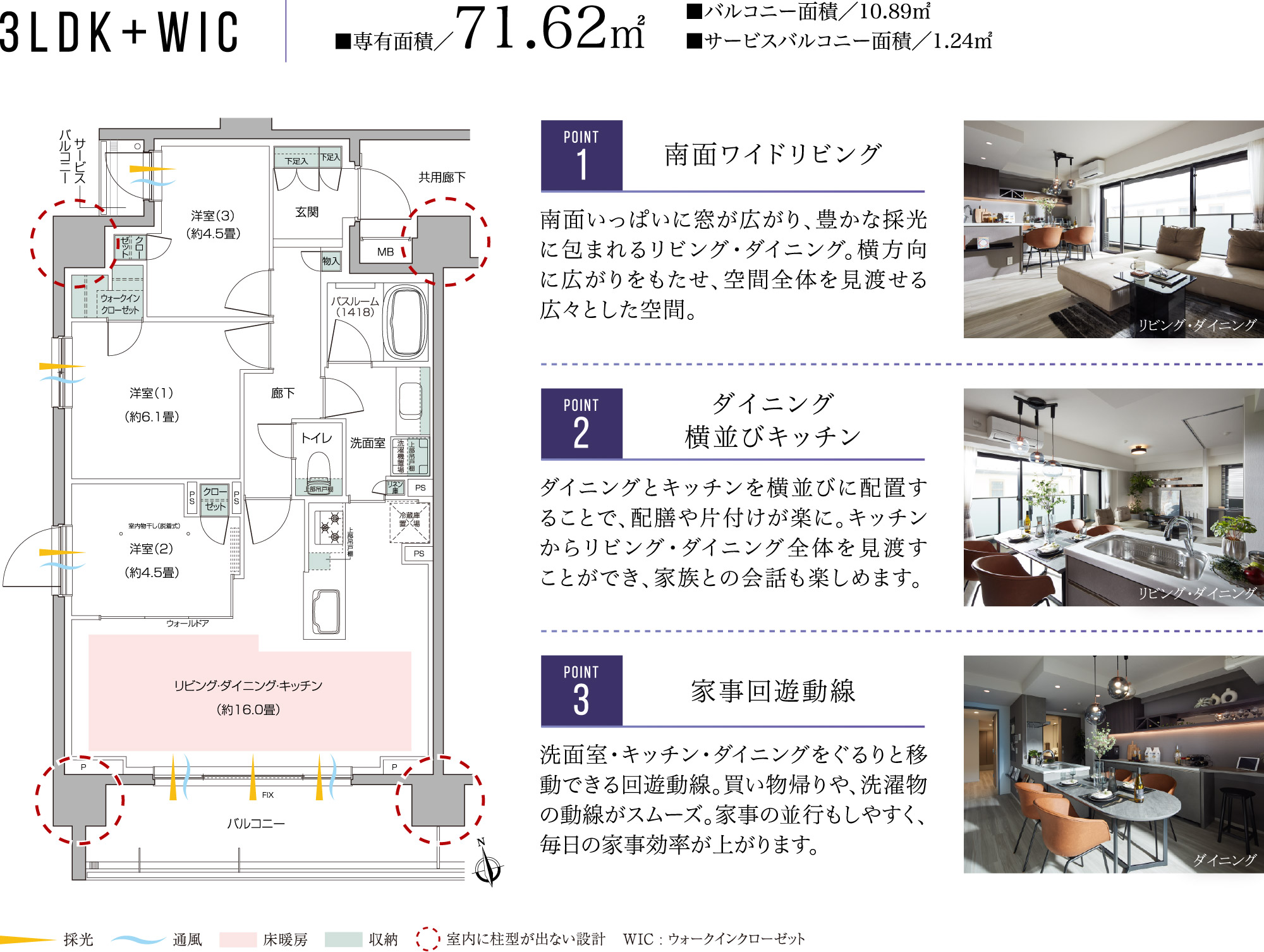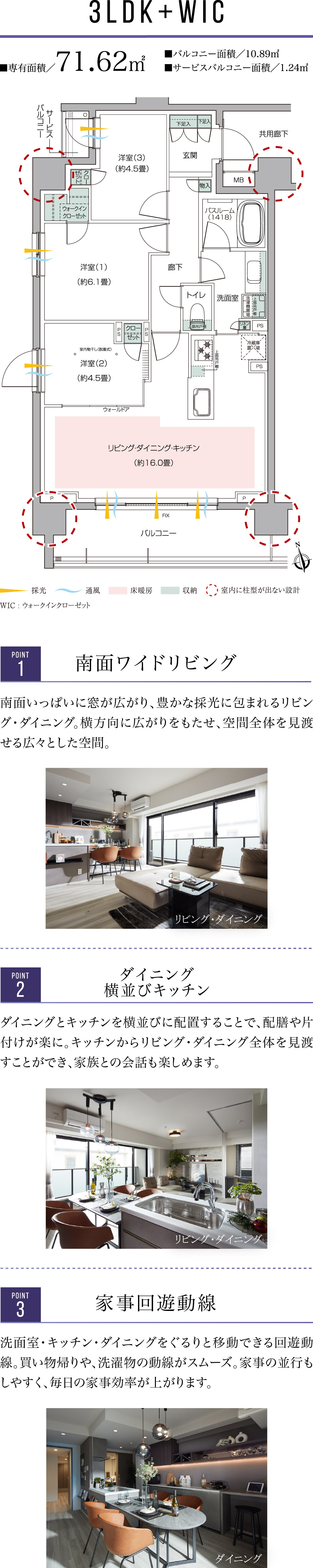 南向きは一年を通して日照時間が最も長く、洗濯物が乾きやすいのが特長。日々の家事を効率良くこなせる環境が整います。