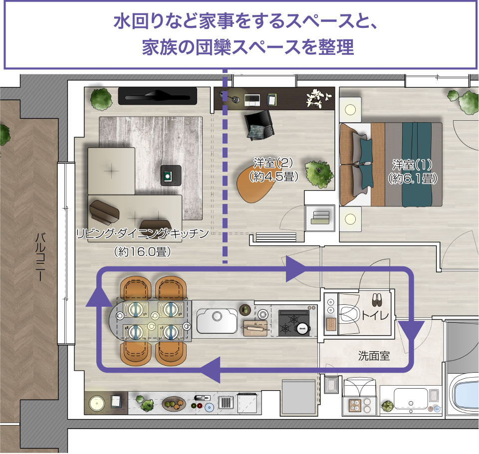 キッチンからダイニング、リビングとのコミュニケーションが取りやすく、家事と団欒の両立が可能。キッチン、洗面室、バスルームの動線が一つにつながることで、料理や洗濯などの家事が効率的に。